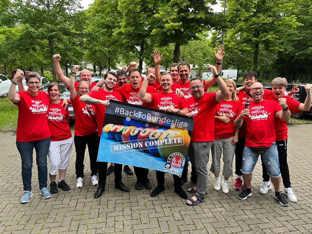 Hürth-Berrenrath: Die Billardabteilung der S.G. Johannesberg steigt nach einem dramatischen Showdown in die 1. Bundesliga auf. Erst das Shootout brachte die Entscheidung in einem lang ausgeglichen Relegationsdrama, welches die erste Mannschaft der SGJ mit 8:3 für sich entschied. Rüdiger Barth, Erik Köhler, Juri Pisklov und Christoph Reintjes bezwingen in Hürth-Berrenrath den PBC Joker Kamp-Lintfort und spielen in der nächsten Saison erstklassig.